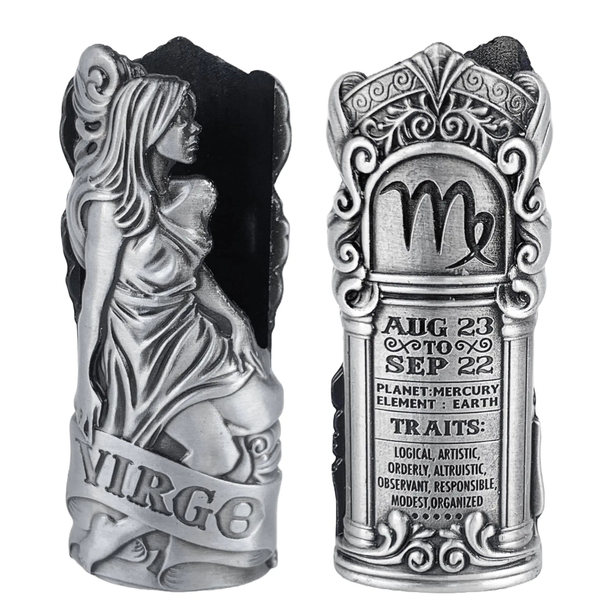 Stay grounded in Virgo style ♍ Crafted from pewter, this durable lighter case fits full-size BIC (J6) lighters. Double-sided carved design adds a touch of cosmic flair. Lightweight, pocket-ready & made to protect your fire with Virgo precision.